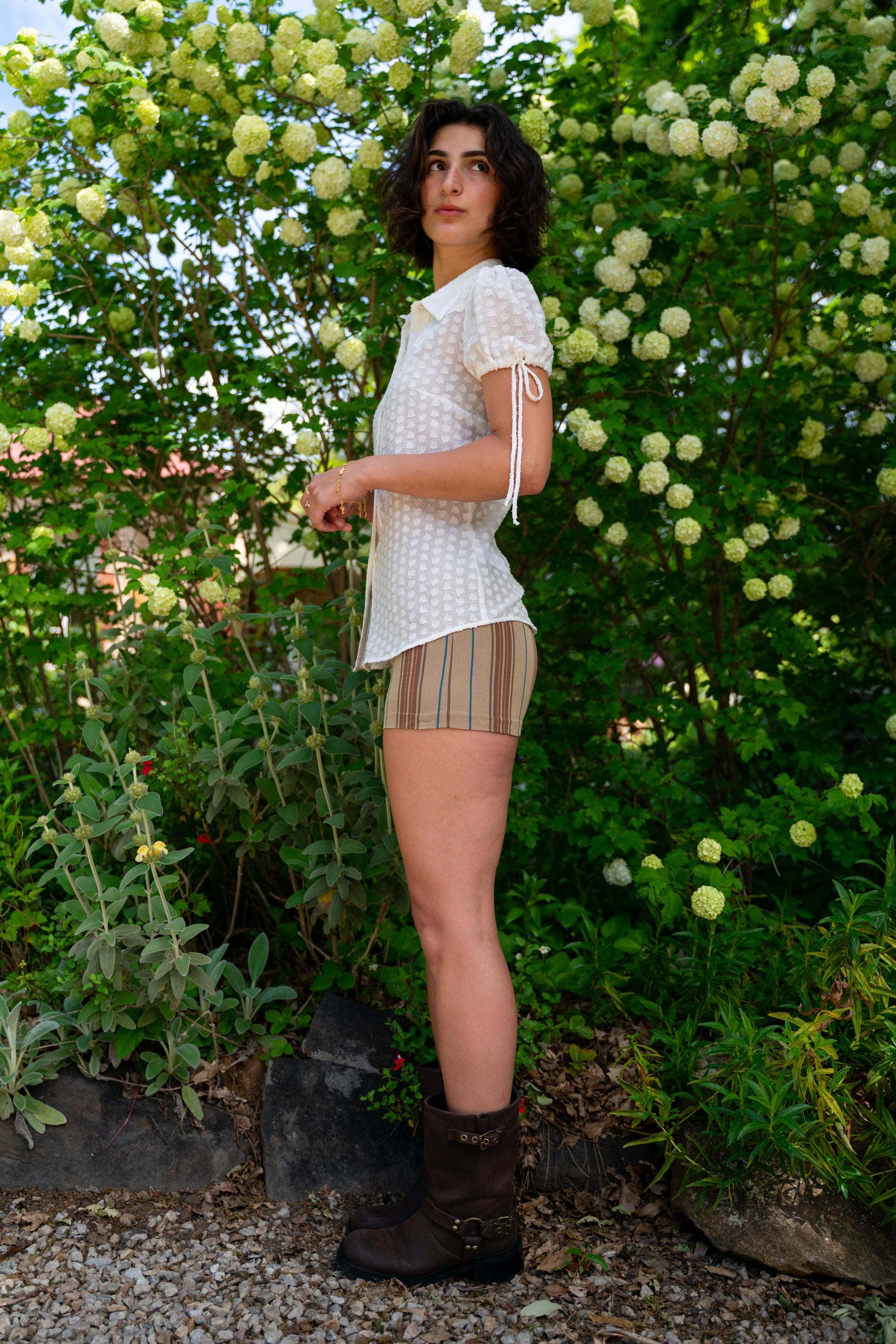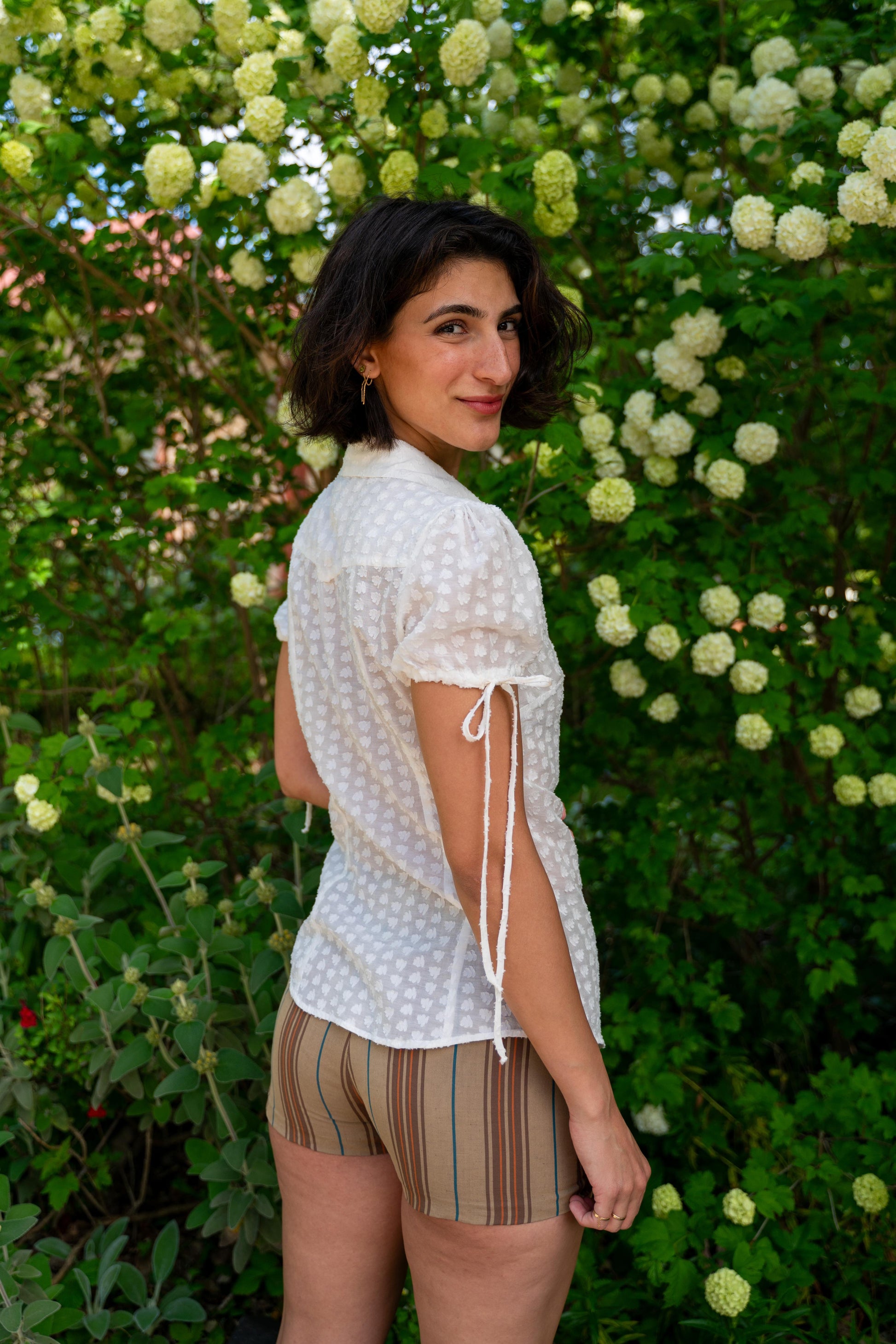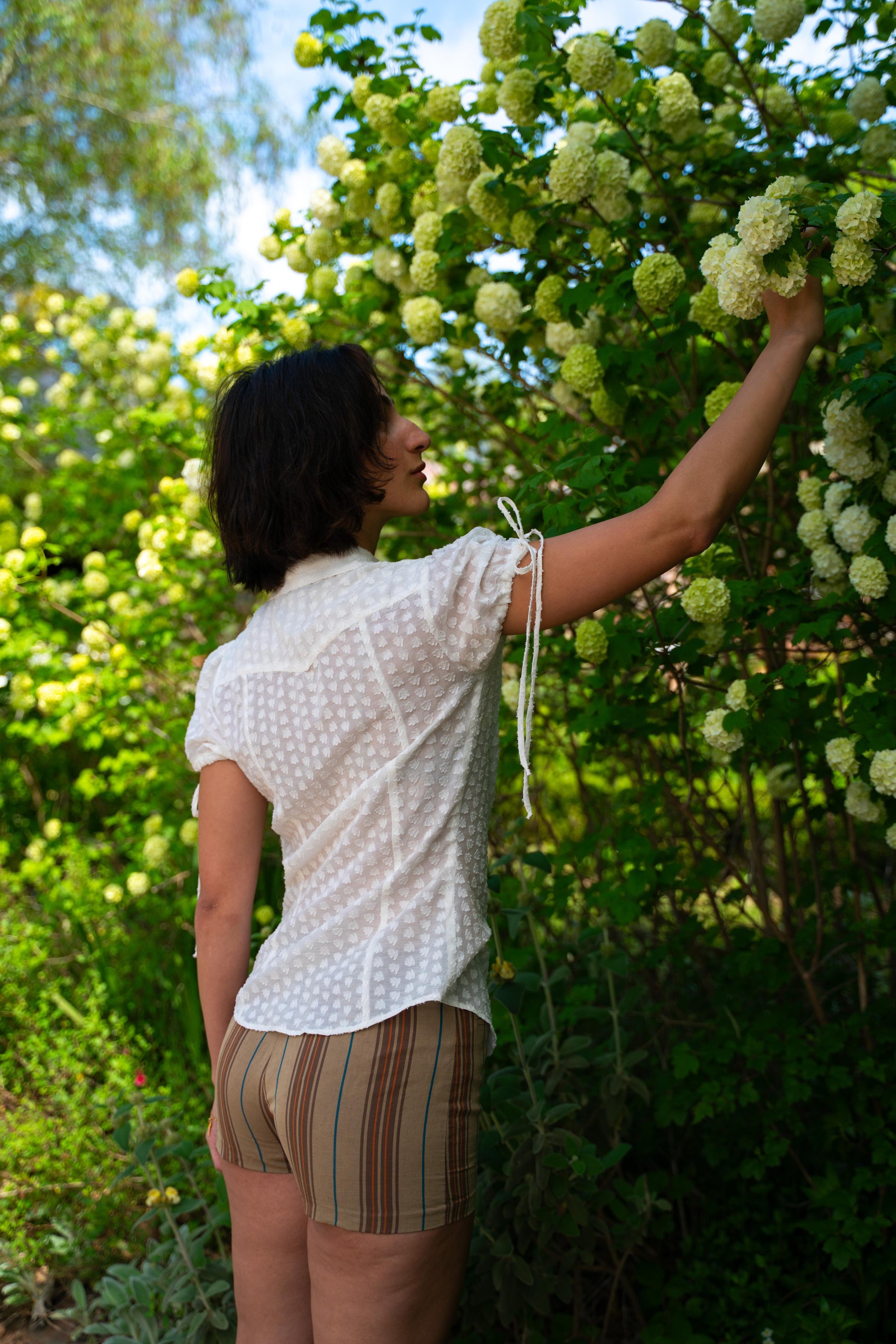 Inspired by vintage style and classic Western shirts, with a babydoll style gathered sleeve and elongated ties. Semi-tailored fit. Designed for those who layer, mismatch and embellish. Semi-sheer, summery, breathable.