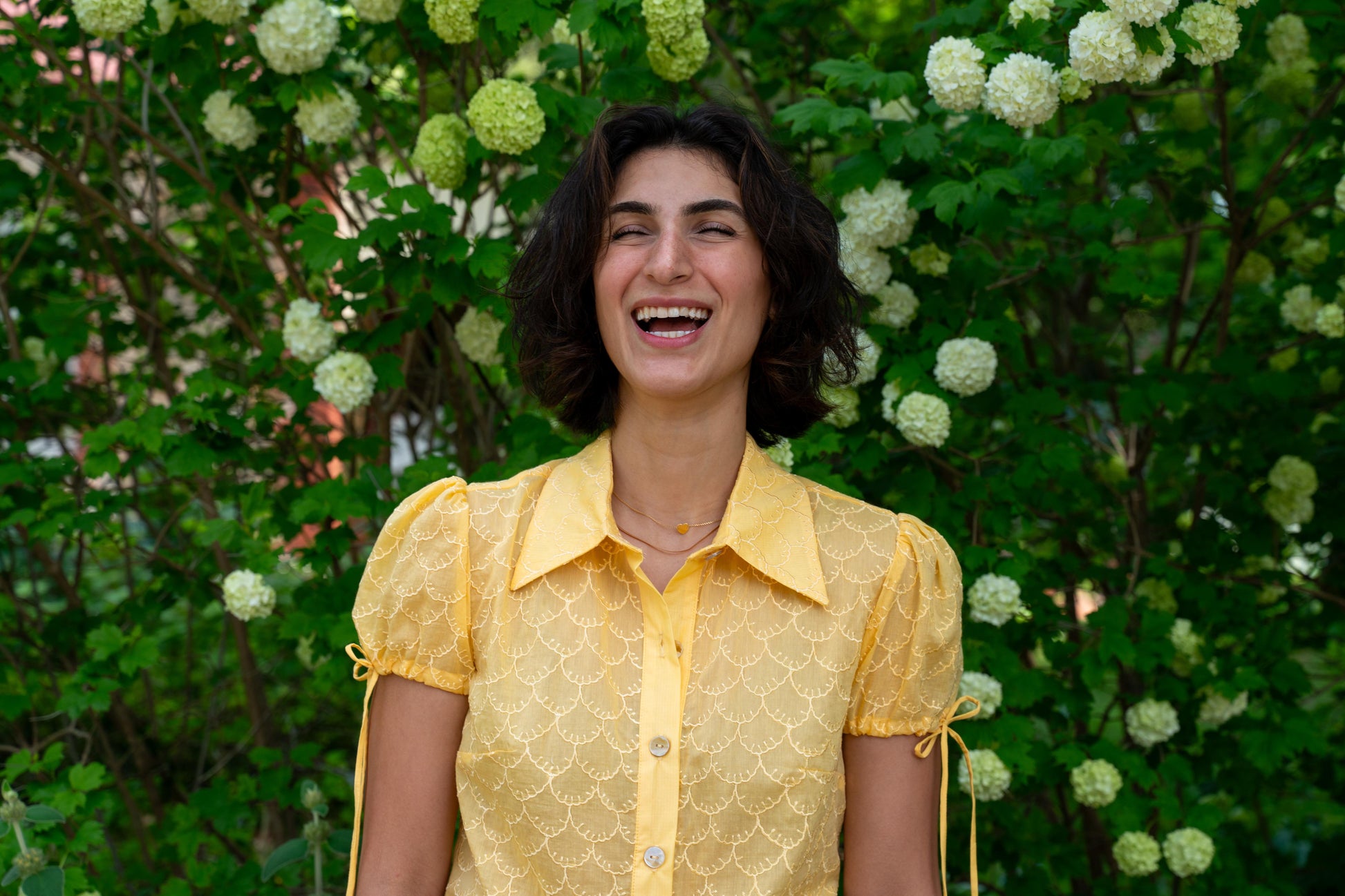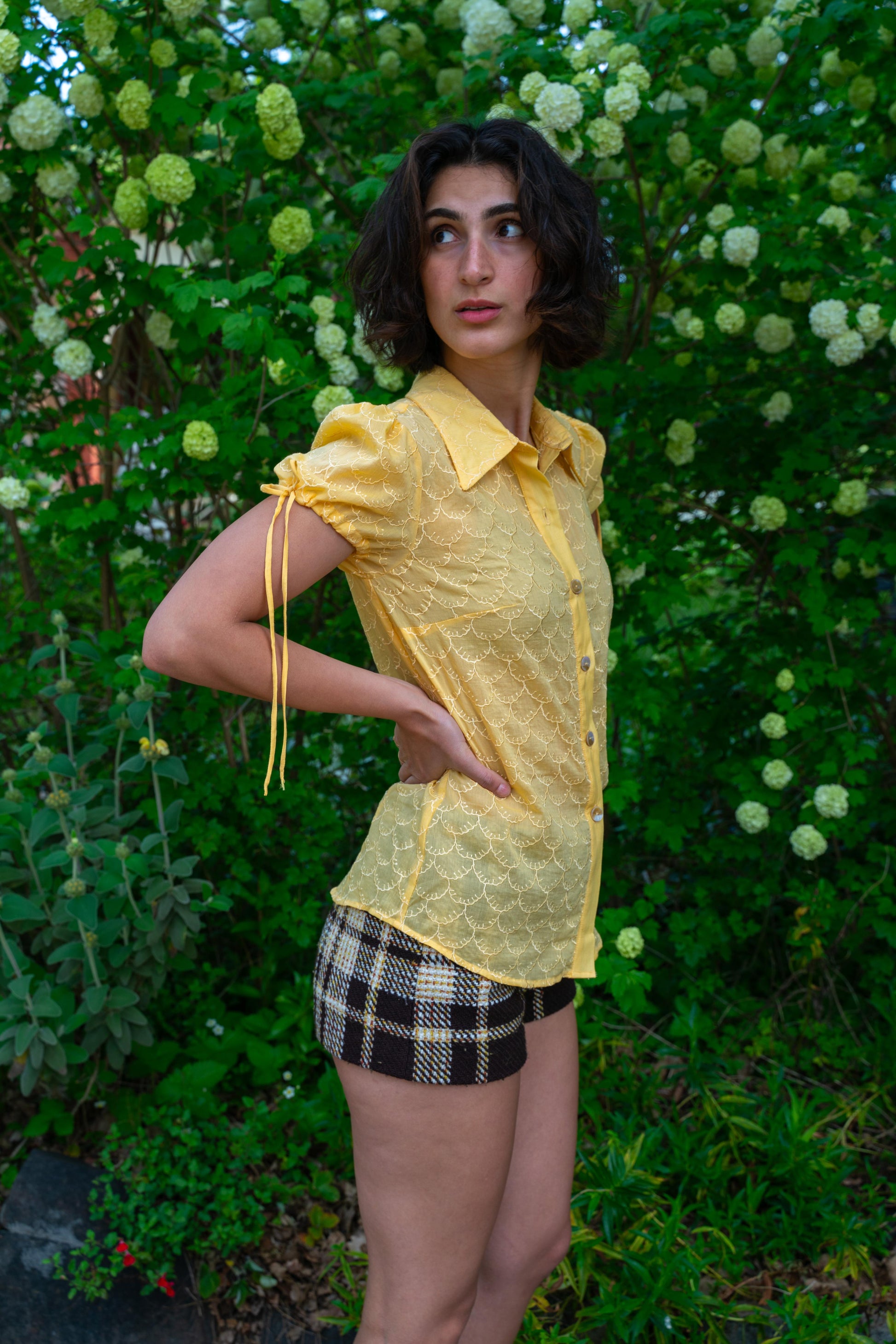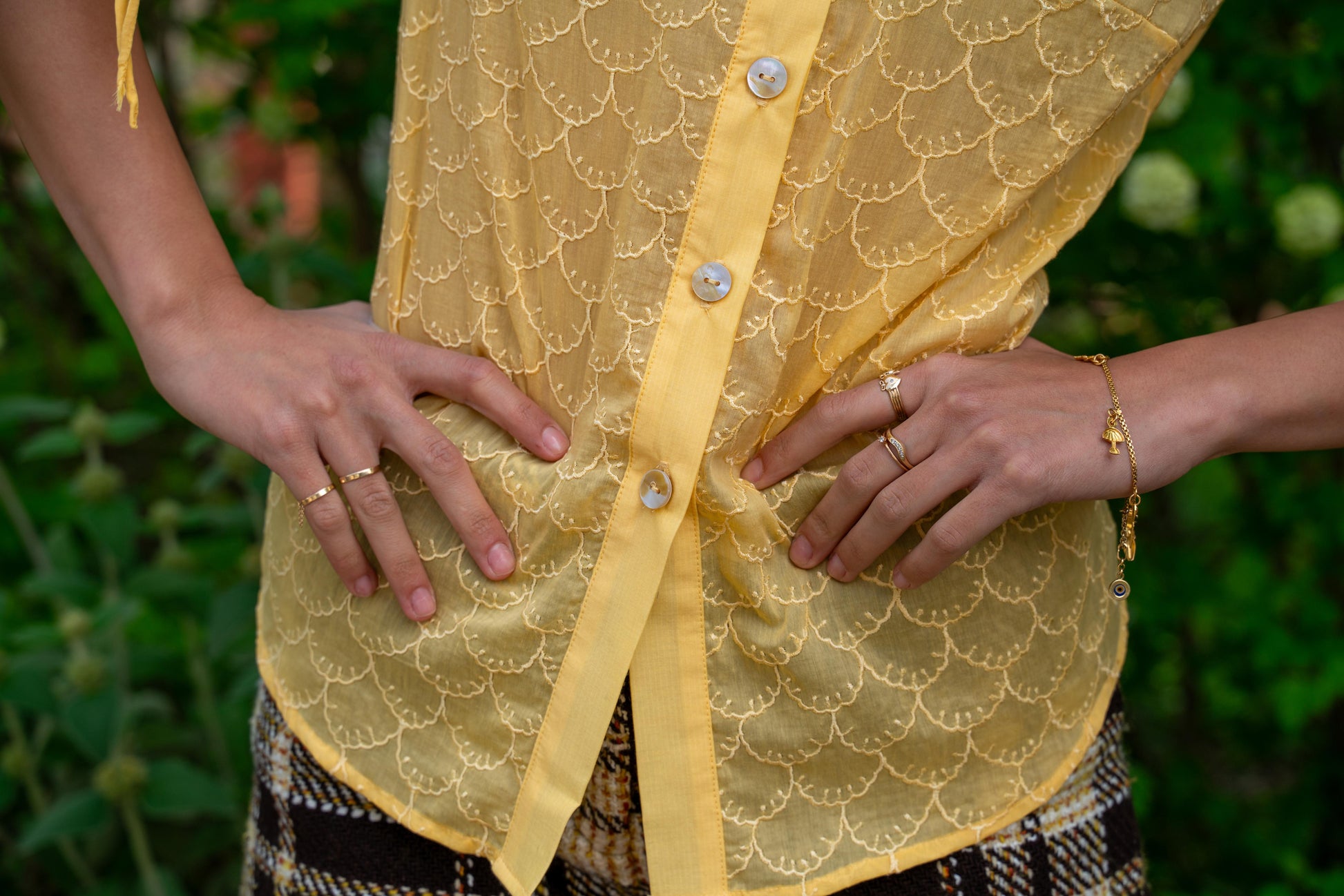 Inspired by vintage style and classic Western shirts, with a babydoll style gathered sleeve and elongated ties. Semi-tailored fit. Designed for those who layer, mismatch and embellish. Semi-sheer, summery, breathable. Features marbled yellow mother of pearl buttons.