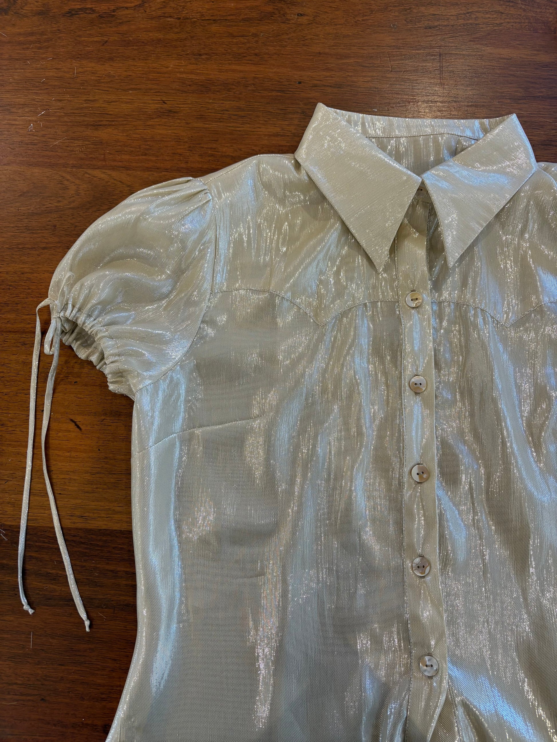 Inspired by vintage style and classic Western shirts, with a babydoll style gathered sleeve and elongated ties. Semi-tailored fit. Designed for those who layer, mismatch and embellish. Semi-sheer, summery, breathable.